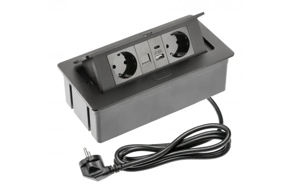 AE-PBSUR2GS-20 Мебельная розетка GTV MULTISOFT, 2хSHUKO, USB A+C, RJ45, кабель 1.5м, черный