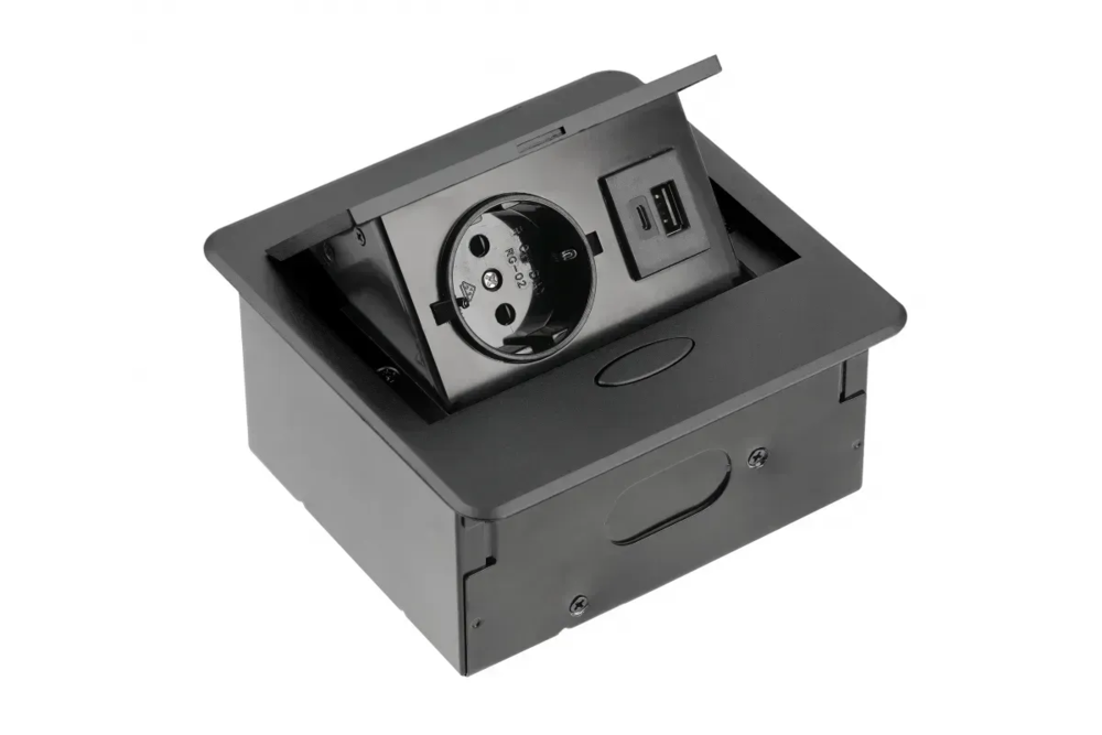 Встраиваемая мебельная розетка GTV AVARO, 1x розетка Schuko, USB A+C, кабель 1,5м, черная AE-PB1SAVA-20N